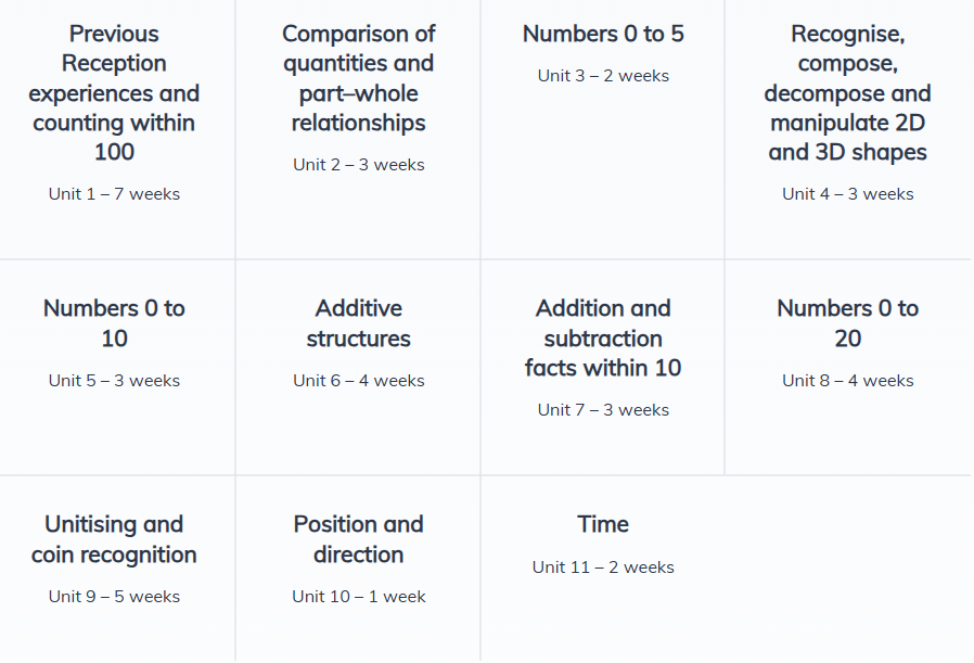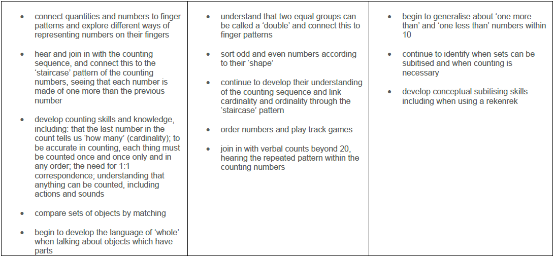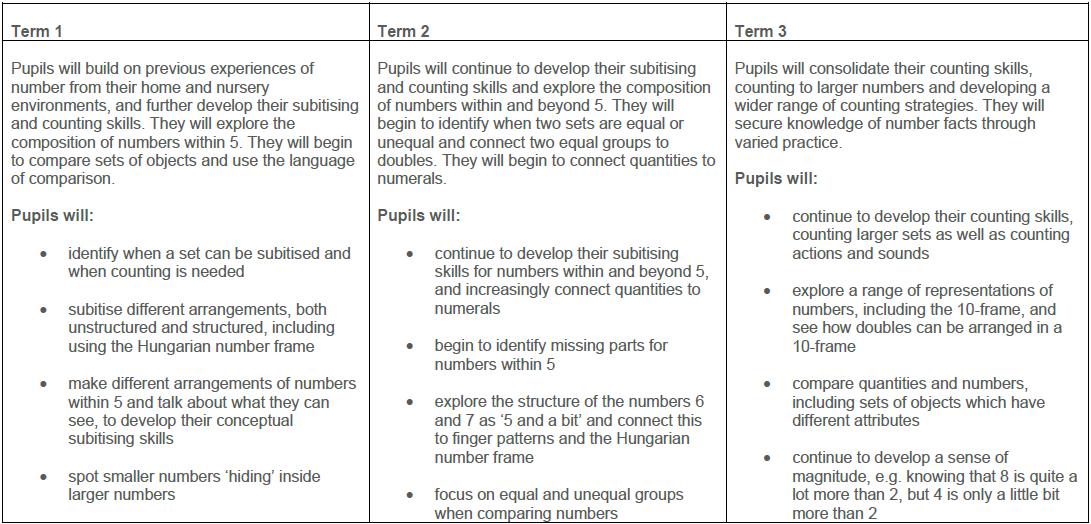In reception, there is a significant focus on mastering the basic skills of number up to 10 as outlined below. More detail of what this looks like from week-to-week can be found here.
